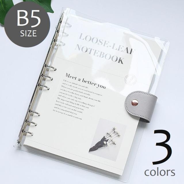 ルーズリーフ B5サイズ 9穴 クリアバインダー ホルダー DIY手帳 取り外し可 レザー調ベルト スナップボタン ノートブック