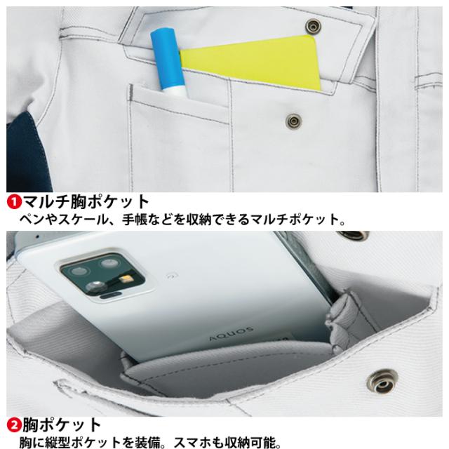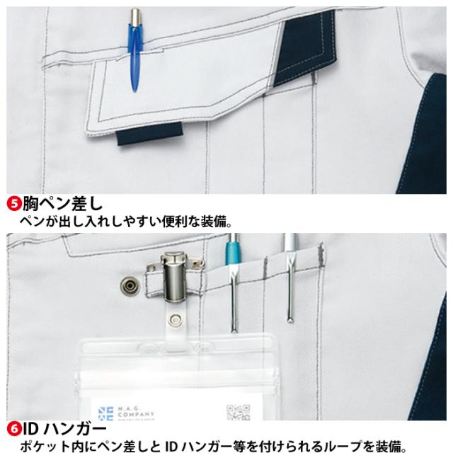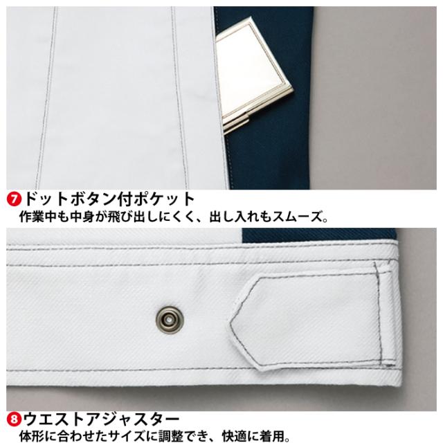 ◇機能:ムービンカット(背中立体裁断)・裾ドットボタン付・ペン差し付(左袖・左胸)・マルチ胸ポケット・胸ポケット・袖口ガード・IDハンガー・ドットボタン付ポケット・ウエストアジャスター