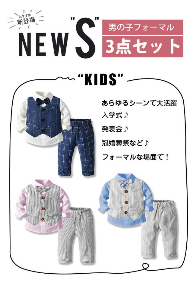 ベビー服 子供スーツ 4点セット 子供フォーマルスーツ 長袖ワイシャツ ベスト 長ズボン 蝶ネクタイ付き 男の子キッズ ジュニア 紳士服 キッズスーツ 子供用スーツ 大きいサイズ 保育園 児幼 稚園児 受験 七五三 入園式 入学式 演出服 発表会 お祝い チェック柄 3色