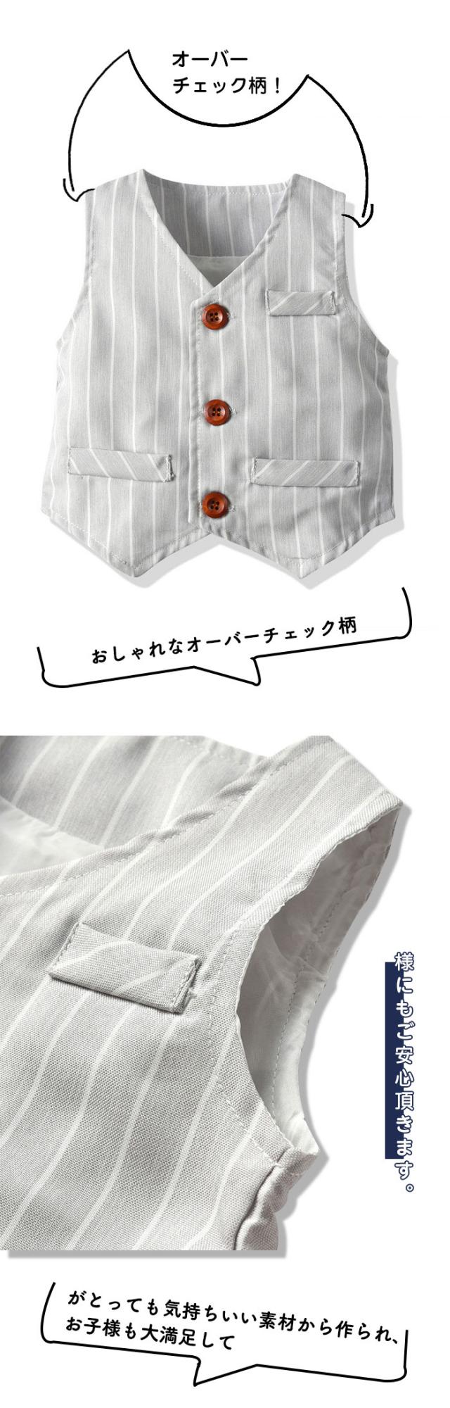 お子様の晴れ舞台に大活躍間違いなし、おしゃれなスタイリングが一着で完成するセットアップ。