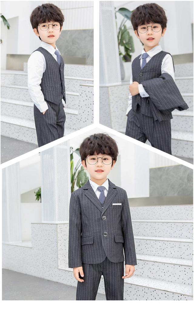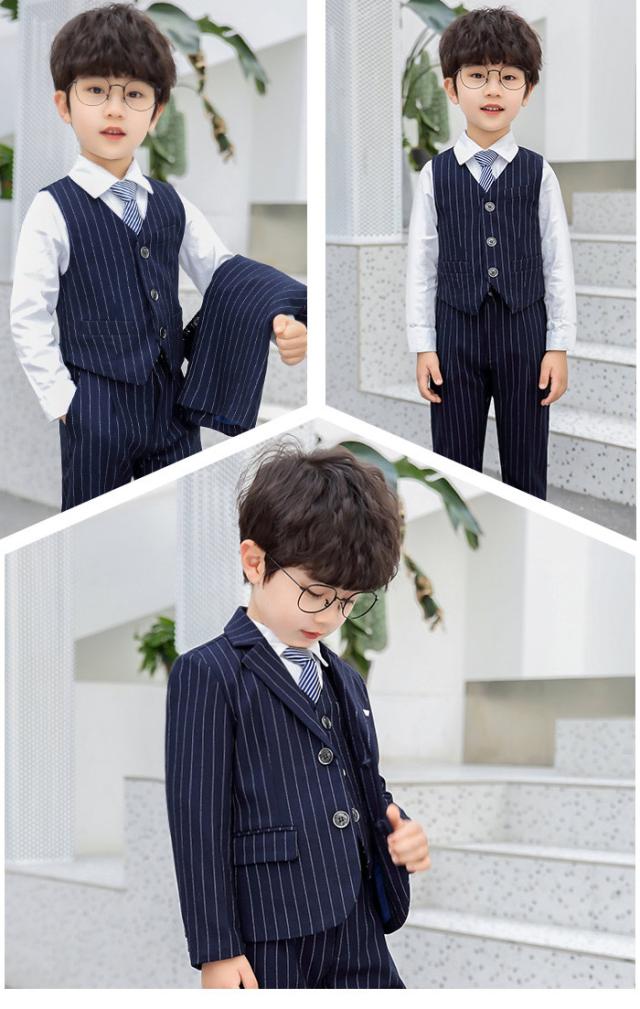男の子 スーツ 子供 フォーマルスーツ スリーピーススーツ キッズ タキシード 子供スーツ 4点セット ジャケット ジレ ベスト パンツ ネクタイ セットアップ キッズスーツ ストライプ柄 センターベント 制服 通園 学院風 子供服 上品 アンサンブル 卒園 入学式 結婚式 発表会
