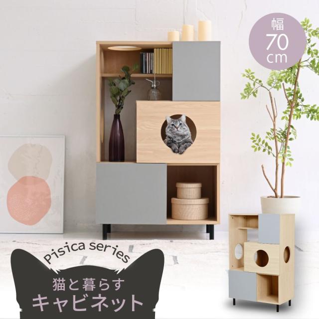大切な猫と楽しく過ごせる猫家具シリーズ”Pisica”。リビングで猫がゆったりとくつろいでいる様子が楽しめるリビング収納です。覗き穴から愛猫の寝姿が見られ、キャビネット中央にはキャットウォームもあるので、猫にとっては飽きない家具です。