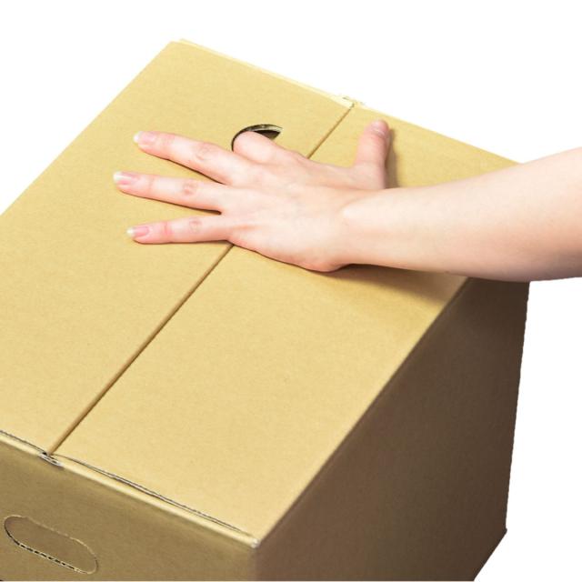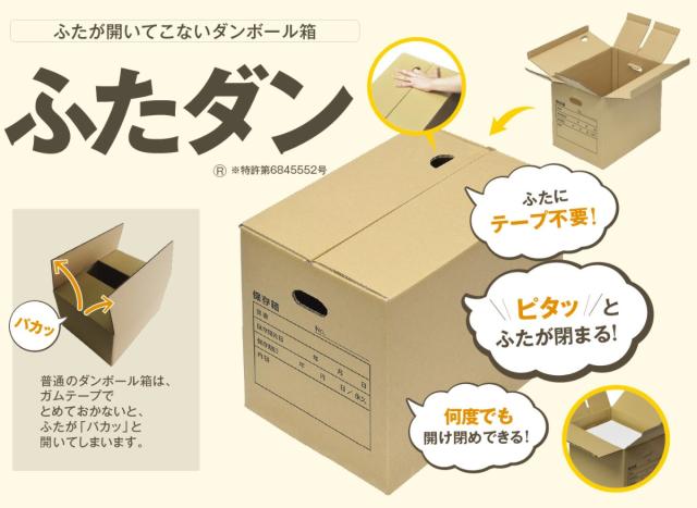 普通のダンボール箱は、ガムテープでとめておかないと、ふたが「パカッ」と開いてしまいます。この「ふたダン」は、ふたにテープをしなくてもピタッとふたが閉まる仕様になっています。テープを使わないので何度でも開け閉めが可能です。自社便などでガムテープで封をする必要がないものや、文章保存などの通常はふたをして保存しておくが、時々ふたを開ける必要があるものの収納におすすめです。