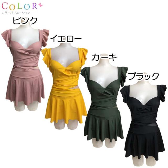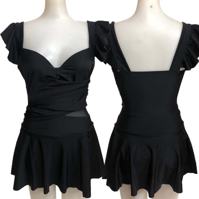 フリルワンピース水着 ワンピース 水着 ワンピ M L 体型カバー レディース 露出控えめ ママ水着 黒 オールインワン 背中開き 透け ギャザー メール便送料無料