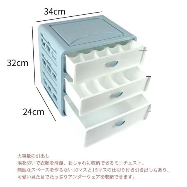 | ■場所をとらない下着収納 卓上でも使えるコンパクトなサイズの下着収納。 リビングや、ベッドサイド、脱衣所に置いたり、クローゼットや押し入れの収納としても使えます。 ■大容量の引出し 埃を防いで衣類を清潔、おしゃれに収納できるミニチェスト。 無駄なスペースを作らない10マスと15マスの仕切り付き引き出しもあり、可愛い見た目でたっぷりアンダーウェアを収納できます。 ■一人暮らしに 新生活を始める大学生や社会人、また単身赴任など単身生活にも活躍す小型サイズのタンスはスペースの有効活用に! クローゼット収納はもちろん、キッチンの小物収納、趣味のコレクション収納などさまざまな場面で男性・女性問わず幅広くお使いいただけます。 ■衣類を整理して収納できる 靴下をペアで収納したり、かさ張るブラやショーツを分けて収納できるので、取り出しやすく見た目もキレイ。 ブラジャーの型崩れ防止にも役立ちます。 角が丸くカットされているので、衣類が引っ掛からず安心です。 ■小物や雑貨の収納にも 下着収納以外にも、ネクタイ、スカーフなどの薄手の衣類や、腕時計やベルトなどのアクセサリー小物の収納にもおすすめです。 | |