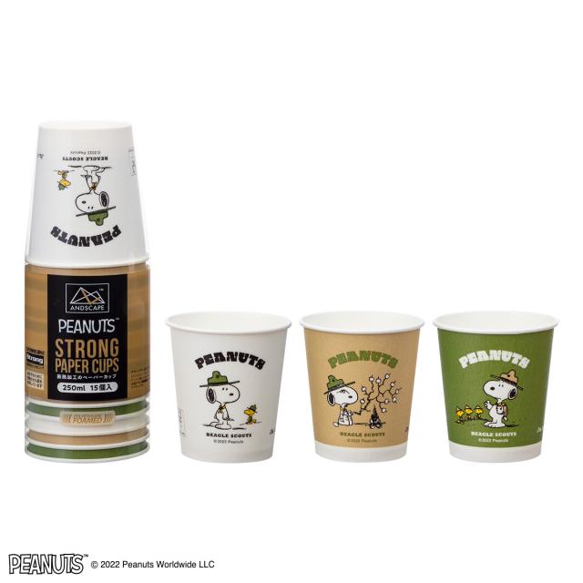 容 量:250ml 入 数:15個 材 質:バージンパルプ100% 外面・内面PEラミネート加工 FSC?森林認証紙使用 生産国:日本 パック内3柄アソート ?2022 Peanuts Worldwide LLC