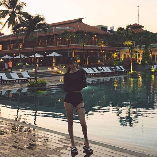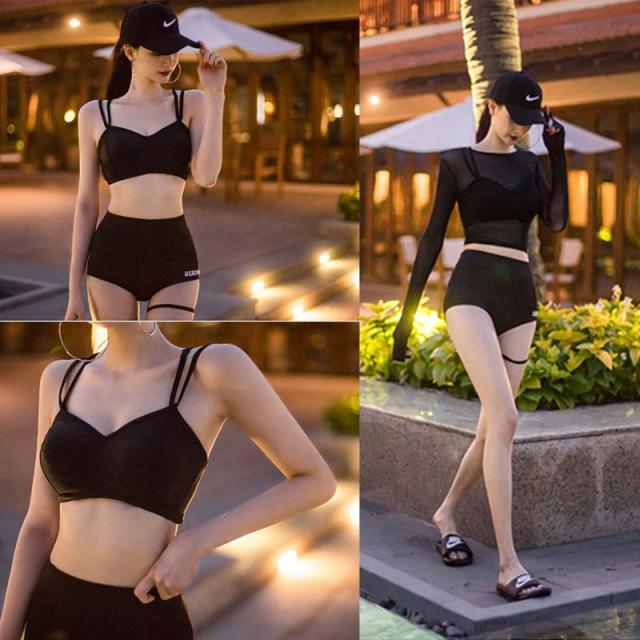 ロングビキニにハイウエストのパンツ、メッシュ生地の長袖がセクシーな3点セット。