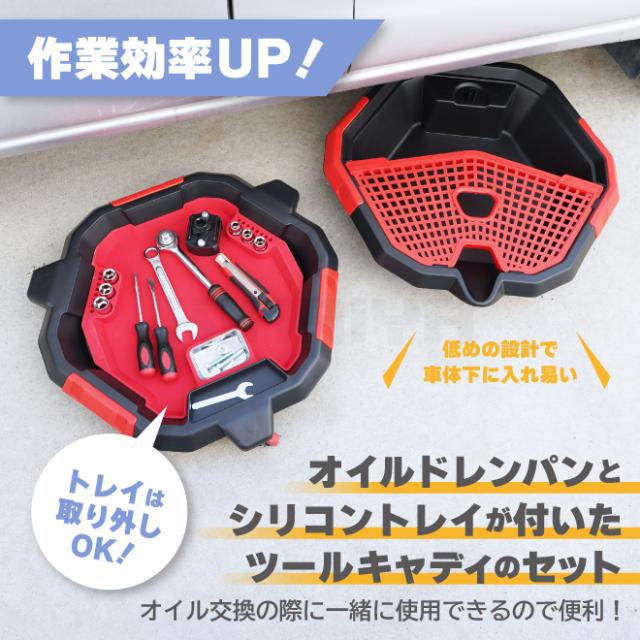 オイル交換に最適! オイルドレンパンとシリコントレイが付いたツールキャディのセット ●軽量で高さを抑えたオイルドレンパンと工具などを整理できるシリコントレイが 付いたツールキャディのセットです ●シリコントレイは取り外し可能 ●オイルドレンパンはツールキャディに重ねて置くことで、車体の下にも 楽に移動できます ●耐衝撃性の高いポリプロピレン製で、長期間使用できます ●容量 8Lのオイルドレンパンには、オイルフィルターホルダーとスプラッシュガードが 付いており、オイル交換に最適です ●工具を置いた時に衝撃を柔らけるシリコントレイはマグネットトレイや ソケット&六角ホルダーを備えています ●使わないときは2つ重ねて収納できるので、場所を取りません ※ガソリン、シンナー等の溶剤にはご使用できません ※あらかじめ、車両のオイル量をご確認ください ※許容量以上は入れないでください 品番:ODP-T |