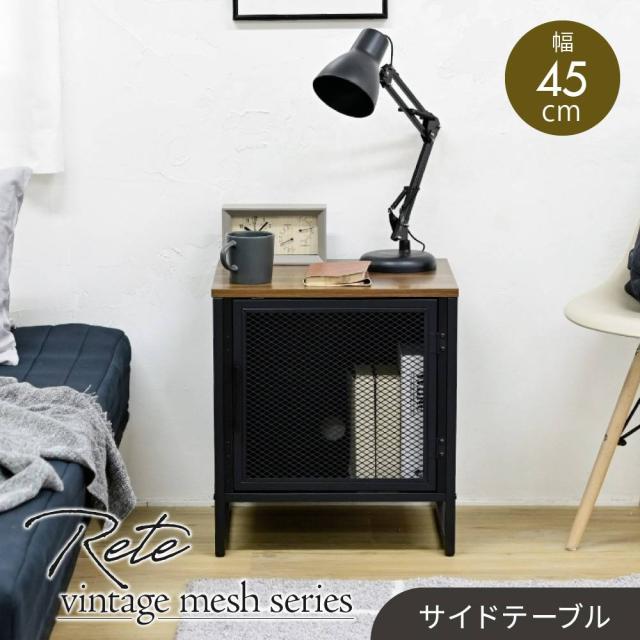 重厚感のあるブラックのスチールフレームと木目の天板が印象的なヴインテージメッシュシリーズ”Rete”のサイドテーブルです。