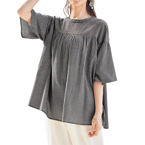 ギンガムチェック切替ギャザーブラウス 五分袖 ブラウス クルーネック レディース 婦人服 ミセス シニア 女性 丸首 チェック柄 体型カバー ファッション 40代 50代 60代 70代 80代 母の日 お母さん 春物 夏物