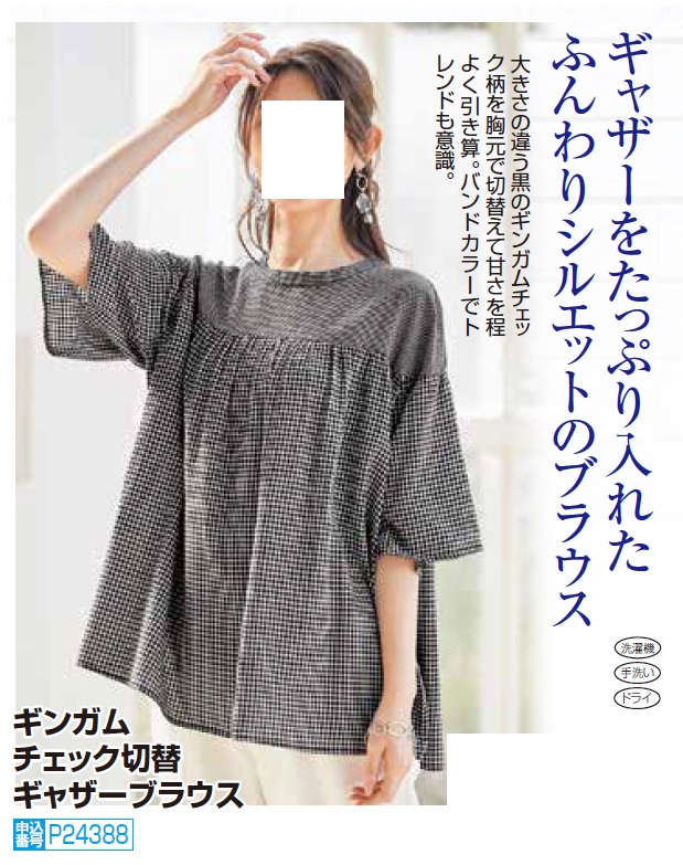 ブラウス 春夏 ギンガムチェック切替ギャザーブラウス 五分袖 ブラウス クルーネック レディース 婦人服 ミセス シニア 女性 丸首 チェック柄 体型カバー ファッション 40代 50代 60代 70代 80代 母の日 お母さん 春物 夏物 nss p24388