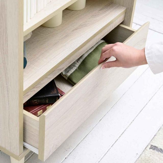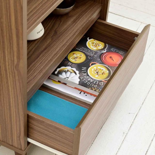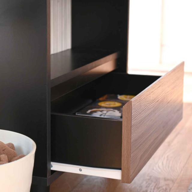 引出しの上部には手をかける部分があり、引き出しやすいです。取っ手をつけないことでフラットで、置く場所を問わない洗練されたデザインとなっています。また、簡単に引き出せるコロレールを採用しているのでお子様でも使いやすいです。