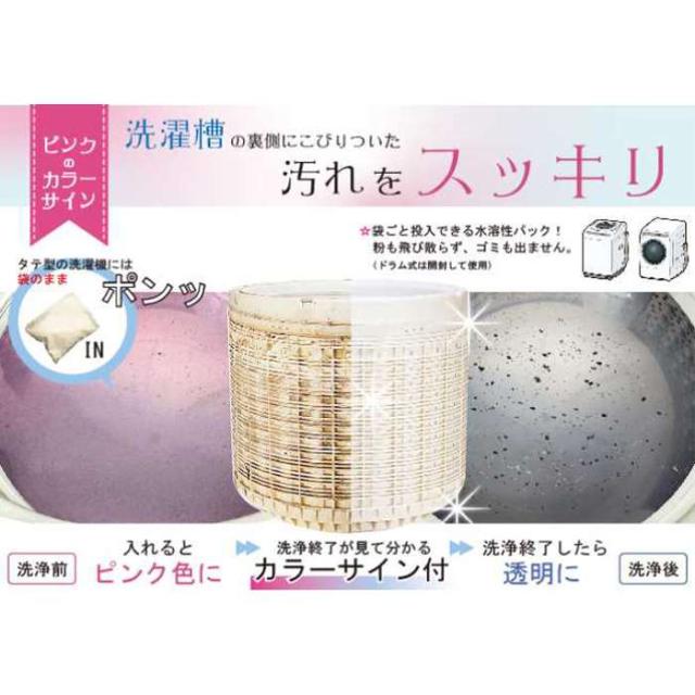 洗濯槽のよごれを一掃。洗濯槽の裏側にこびりついた汚れをスッキリ。洗浄終了が色の変化で分かる、便利なピンクのカラーサイン機能付き。水溶性パックを採用!粉の飛び散りがなく袋のゴミが出ません。(パックの中身はさらさらパウダーでさっと溶けます)。酸素系成分使用、ステンレス槽、プラスチック槽のどちらにも使えます。■正味量:(100g×3袋)。■使用量の目安:7kg洗い(水量60L)までの洗濯機槽に対し、1回1袋。※水温の低い場所や水質、水量等の条件により、カラーサインが若干残る場合もあります。※個装サイズはヘッダー含む。※着色剤…合成着色剤(化学名アマランス…赤色2号)。