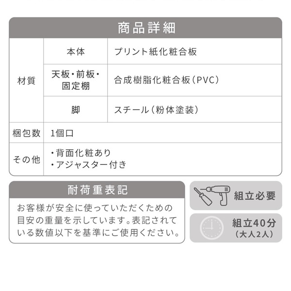 素材:[本体]プリント紙化粧合板 [天板・前板・固定棚]合成樹脂化粧合板(PVC) [脚]スチール(粉体塗装)