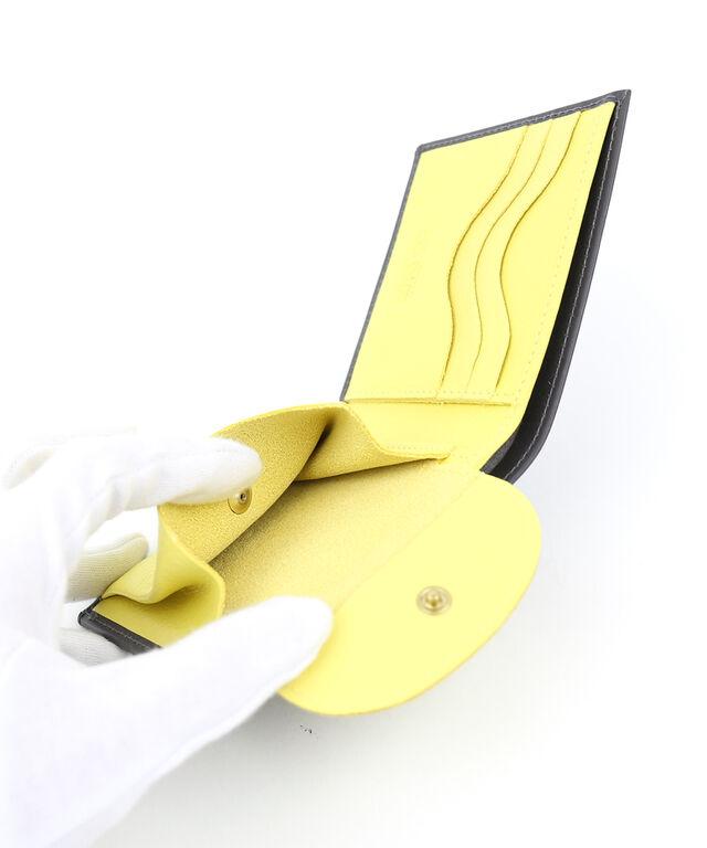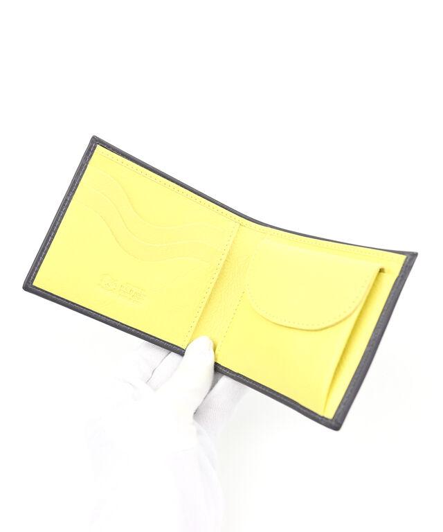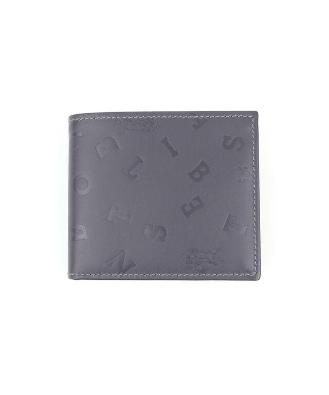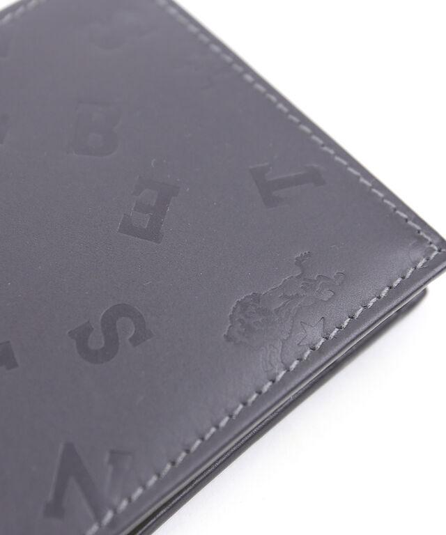 ブランドロゴとネームのアルファベットを型押しした二つ折り財布。