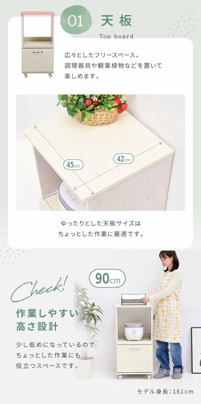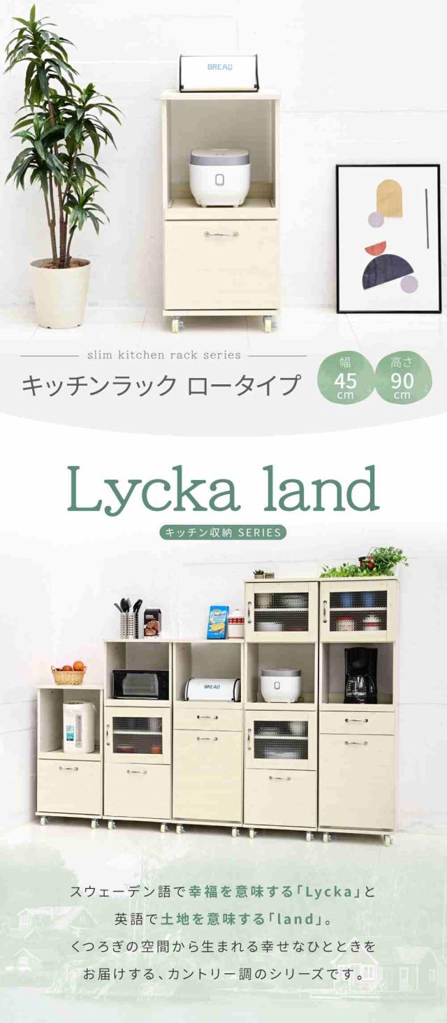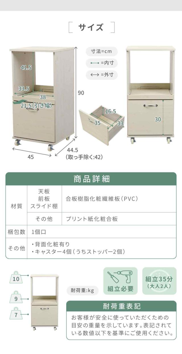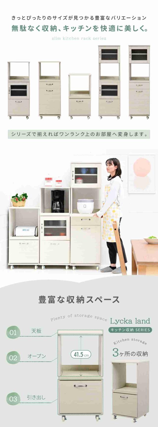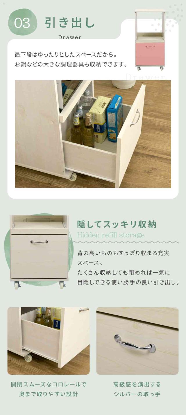 【期間限定特別価格】 キッチン収納ラック レンジ台 スリム レンジボード ロータイプ キャスター 付き 引き出し式 キッチン家具 収納 スライド 棚付き ラック ホワイト 白 木製 45