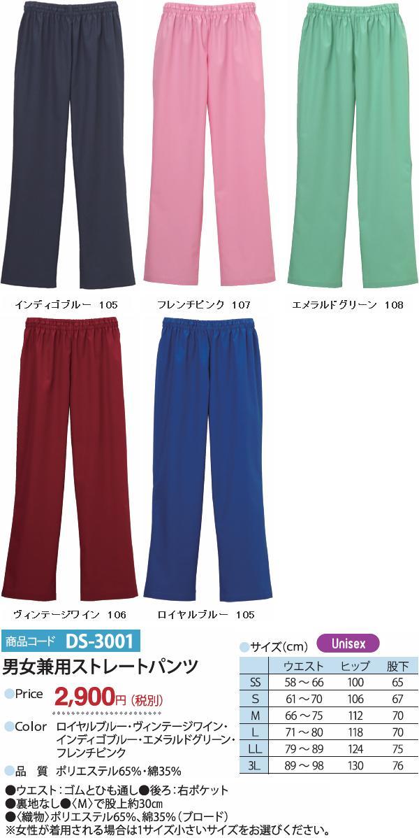 DS-3001 男女兼用 ストレートパンツ 全5色 SS?3L【メーカー直送品】【医療ウェア ナースウェア スクラブ パンツ ズボン】
