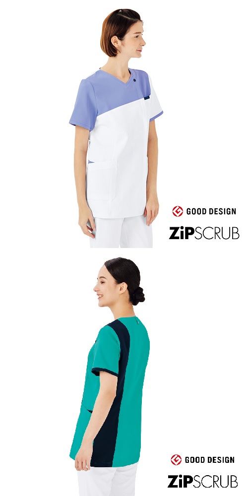 グッドデザイン賞受賞のジップスクラブは、髪型の乱れやメイク崩れのストレスを解消した、「羽織って着られる」脱着のしやすさも高く評価されているスクラブです。