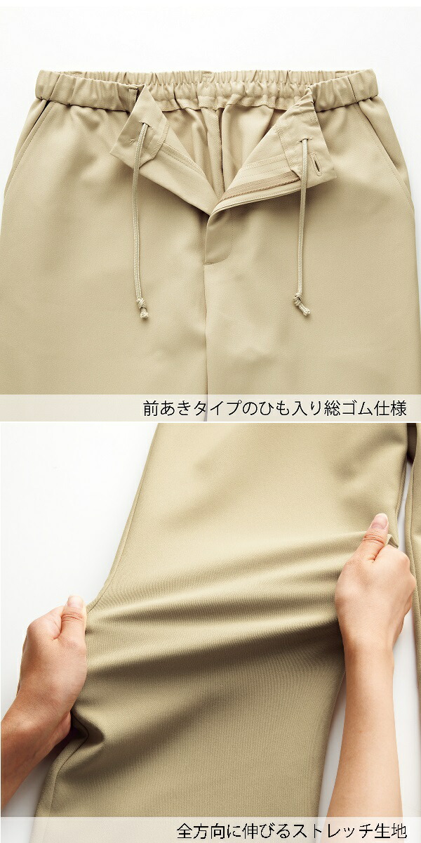 アジャスター付きのウエストは、前開きでウエストゴム仕様、ウエストひも入りなので、サイズ調整も簡単。幅広い体型の方に窮屈感なく快適に着用いただけます。