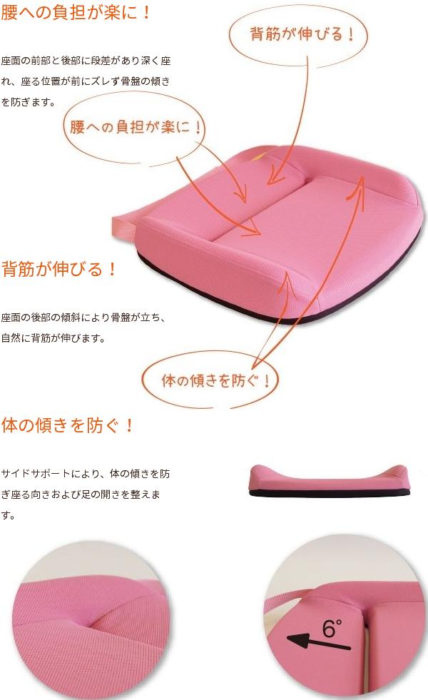 ◇座るとき、骨盤は後ろへ傾き、それに連動して背骨も曲がってしまいます。 正しく座るためには、骨盤の状態を、立っているときに近づける必要があります。 本商品は、骨盤の後傾を防ぎ、美しい姿勢を保ちます。