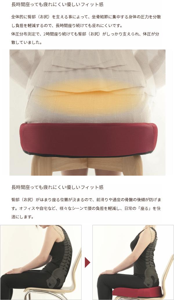 全体的に臀部(お尻)を支える事によって、坐骨結節に集中する身体の圧力を分散し負担を軽減するので、長時間座り続けても疲れにくいです。