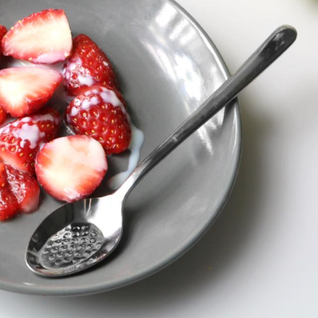 イチゴをつぶして食べられるイチゴスプーンです。イチゴをつぶし、ミルクをかけたりヨーグルトに混ぜたりと、ジューシーなイチゴのデザートをお好みで作れます。