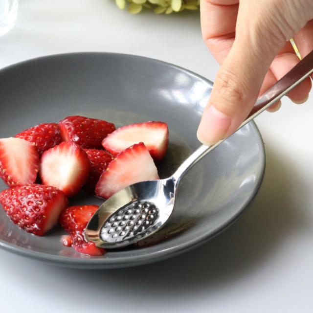 スプーンの底部は、イチゴをつぶしやすい平ら形状になっています。丈夫なステンレス製で、食洗機で洗えるのでお手入れが簡単です。