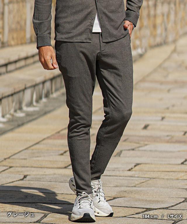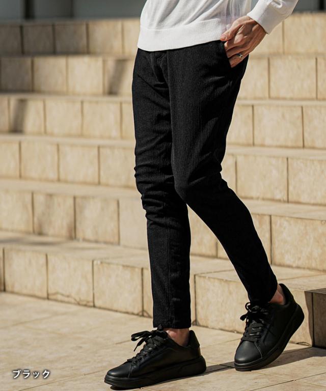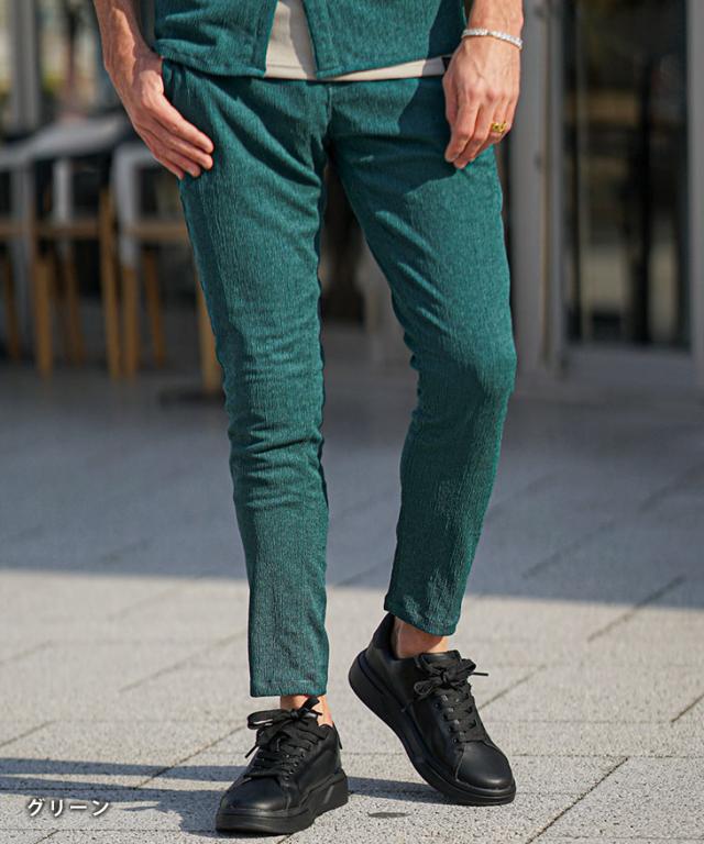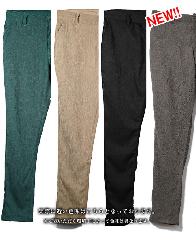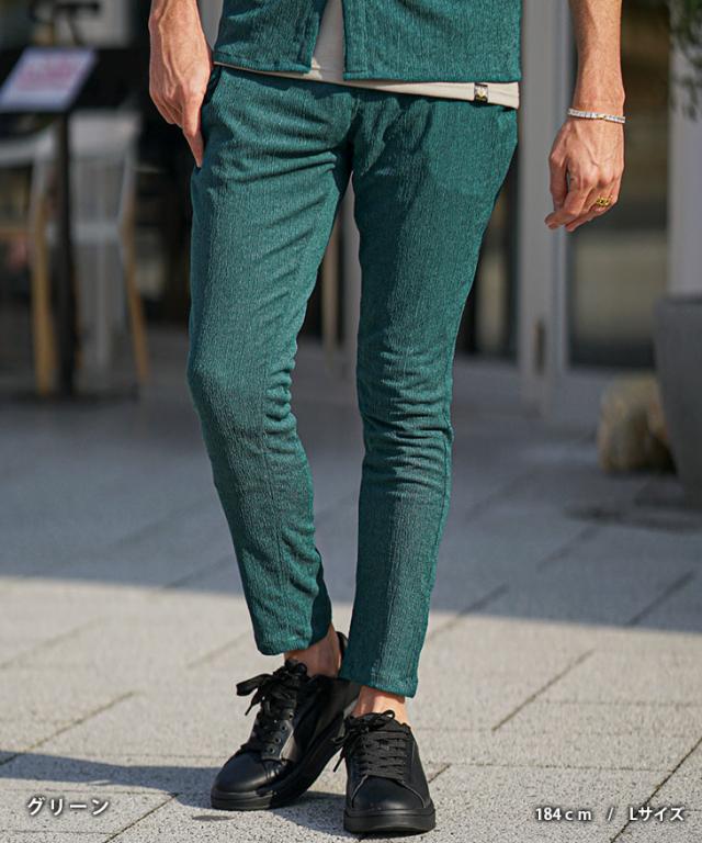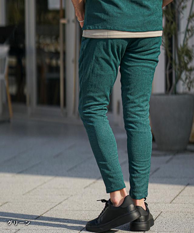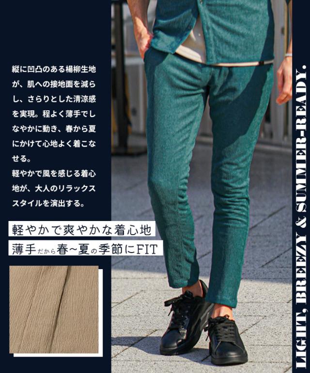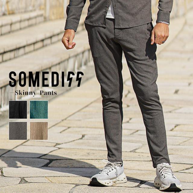 SOMEDIFF(サムディフ)『楊柳スキニーパンツ』【楊柳スキニーパンツ】■Design/デザインスマートに夏を穿きこなすイージーなスキニーパンツ。縦方向に凹凸のある細かいシボ(不規則なシワ模様)が入っている楊柳生地を使用することで、肌への接地面を減らし清涼感のある着こなしが可能に。それだけでなく、無地でもシンプル過ぎないデザイン性を演出。脚のラインが出るシルエットに仕上げることで見た目も穿き心地も爽やかに。楽してスマートに魅せるスキニーでストレスフリーな夏を楽しめ。■Material/素材感ポリエステルを使用し、季節を感じる軽やかさが特徴。程よく薄手でしなやかさがあり、快適な着用を実現する。