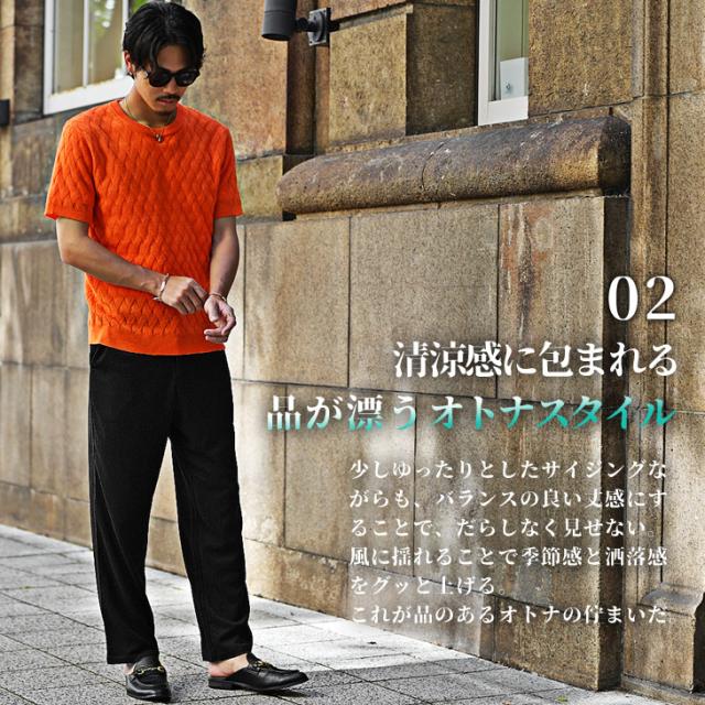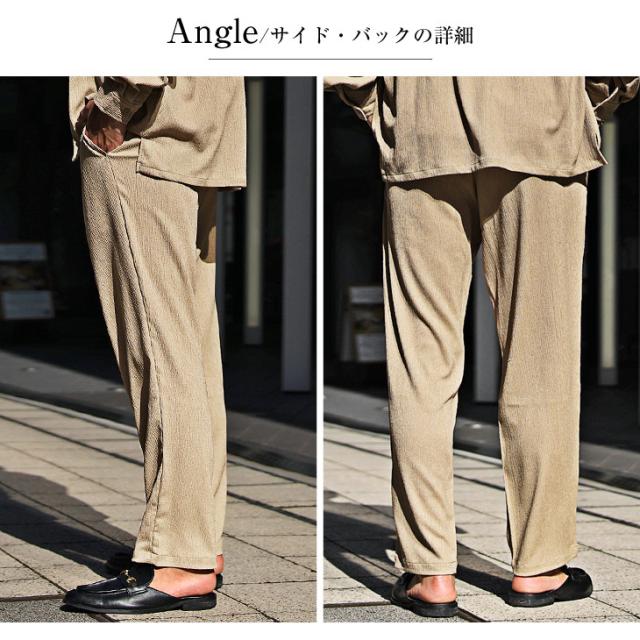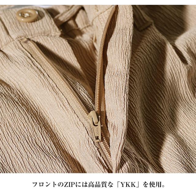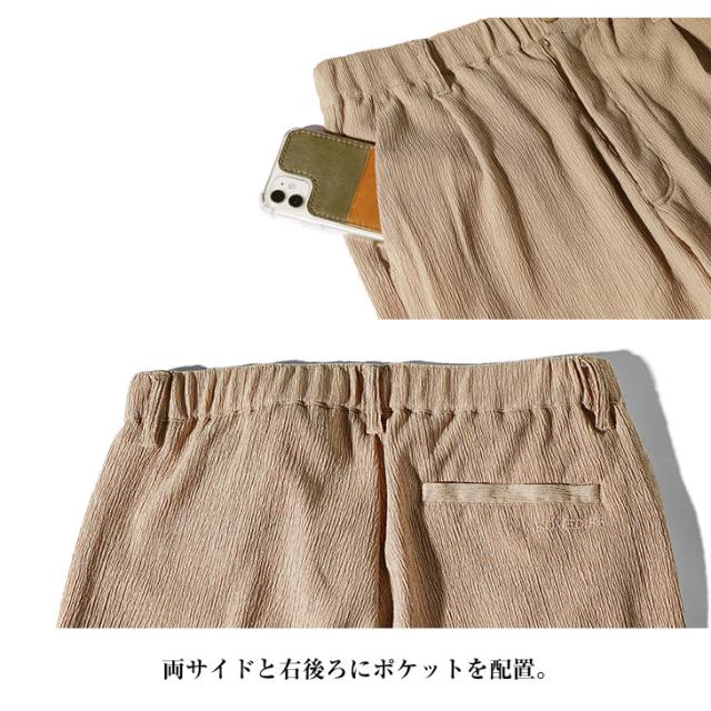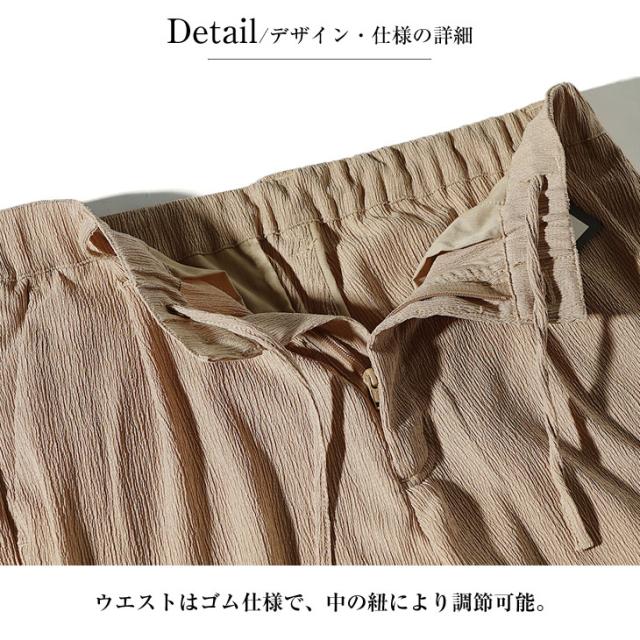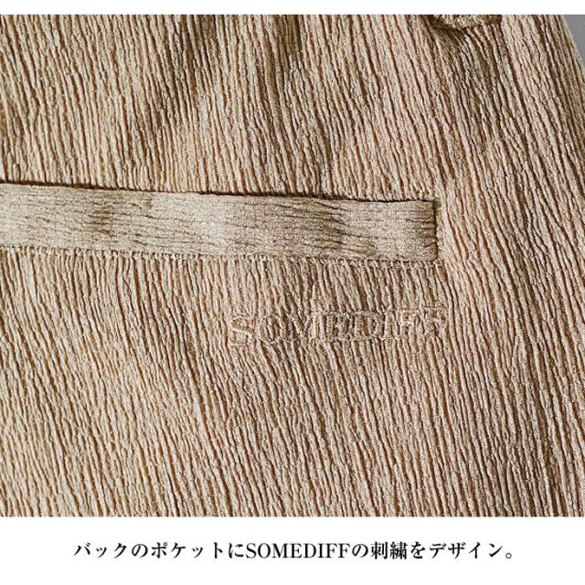 SOMEDIFF(サムディフ)『サマーリゾートワイドパンツ』【サマーリゾートワイドパンツ】■Design/デザイン開放的なラフさを楽しむイージーなワイドパンツ。縦方向に凹凸のある細かいシボ(不規則なシワ模様)が入っている楊柳生地を使用することで、肌への接地面を減らし清涼感のある着こなしが可能に。それだけでなく、無地でもシンプル過ぎないデザイン性を演出。窮屈感の感じないワイドシルエットでストレスフリーな穿き心地を楽しめる。風に揺れる洒落感を纏い、オトナの余裕を魅せつけろ。