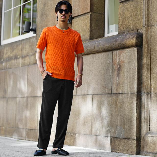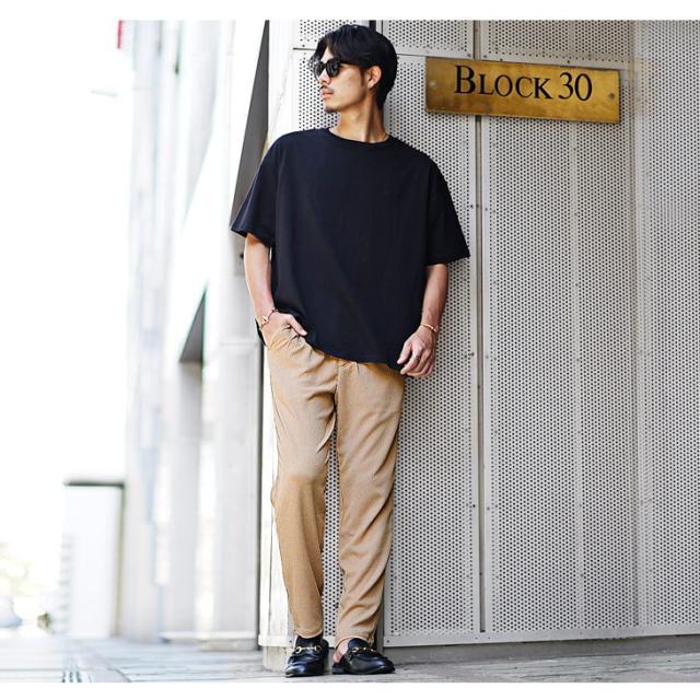 全体的にややゆとりのあるサイズ感です。柔らかい生地感で伸縮性もあるのでノンストレスで着用することができます。清涼感のある素材を活かしたワイドシルエットはトレンド感と大人感が生まれ、とてもオシャレです。