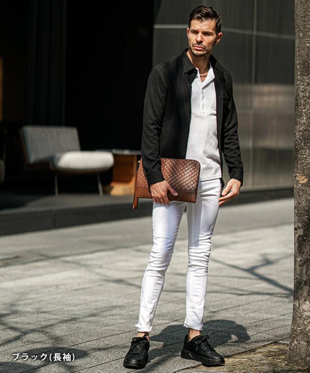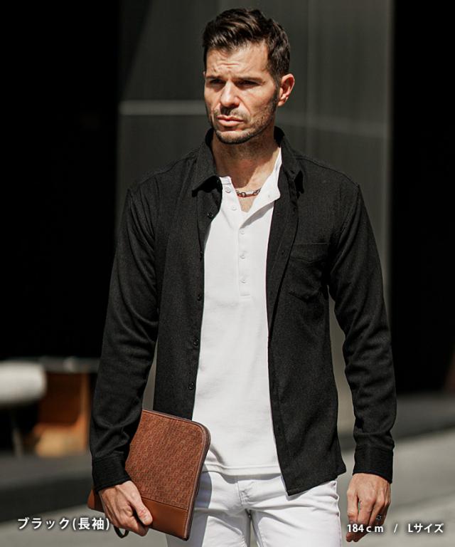 前のボタンを閉めても窮屈感なく、優しく体にフィットするようなサイズ感です。伸縮性もあり、楽に着用することができます。ワンサイズ下のLサイズだと腕、胸部分が少しタイトめになります。体のシルエットがキレイに見えるシャツですね。