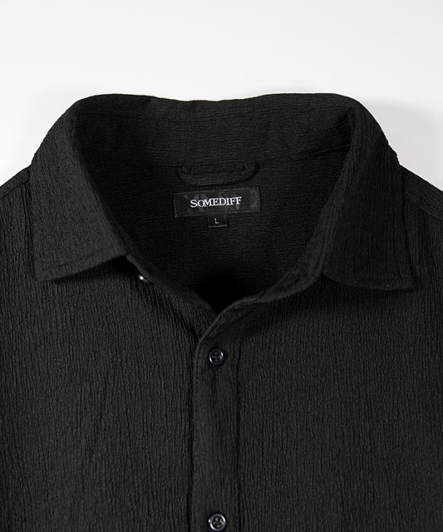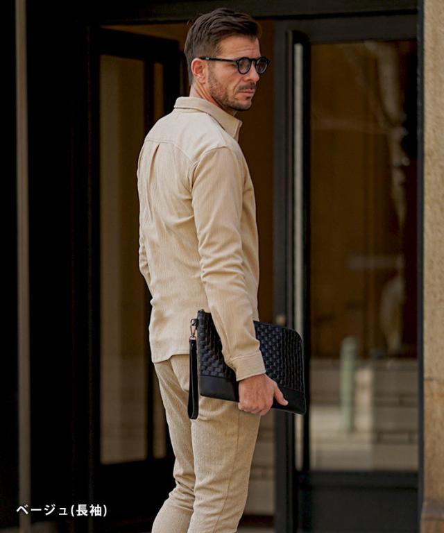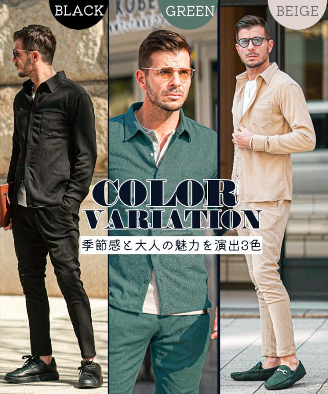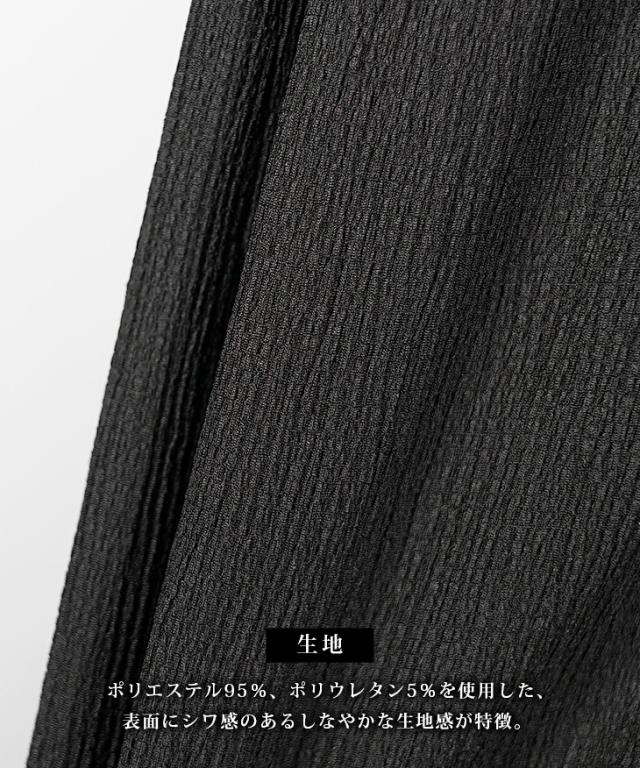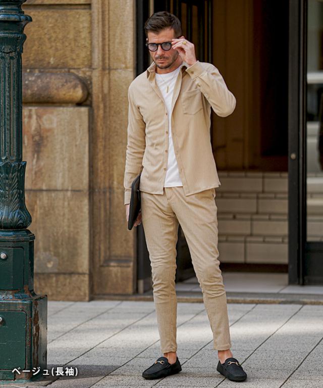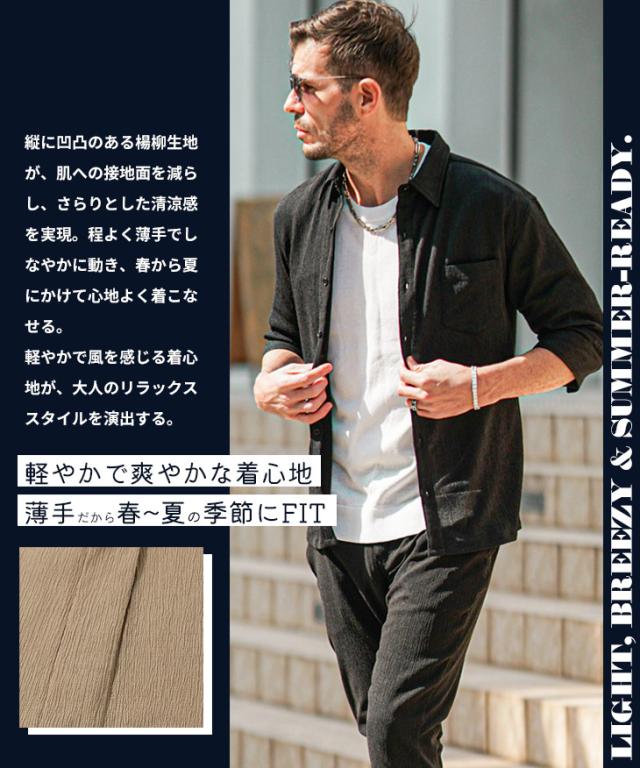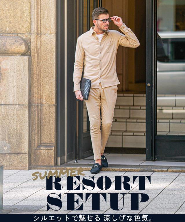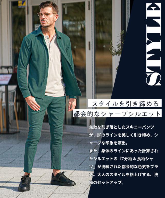 SOMEDIFF(サムディフ)『サマーリゾートスキニーセットアップ』【サマーリゾートスキニーセットアップ】■Design/デザイン程よくスリムに着こなす快適素材の7分袖シャツとスキニーパンツのセットアップ。縦方向に凹凸のある細かいシボ(不規則なシワ模様)が入っている楊柳生地を使用することで、肌への接地面を減らし清涼感のある着こなしが可能に。それだけでなく、無地でもシンプル過ぎないデザイン性を演出。肌をチラ見せする7分袖シャツと脚のラインを表現するスキニーパンツで爽やかさと色気を両立させる。タイトに着こなすリラックス感で新感覚の夏を楽しめ。