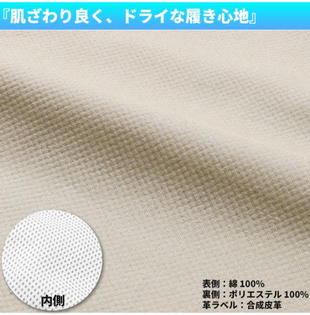 綿の優しい肌ざわりとポリエステルの軽さ、裏側をメッシュにすることで蒸れを軽減し、優れた『吸湿性』と『放湿性』を実現しました。