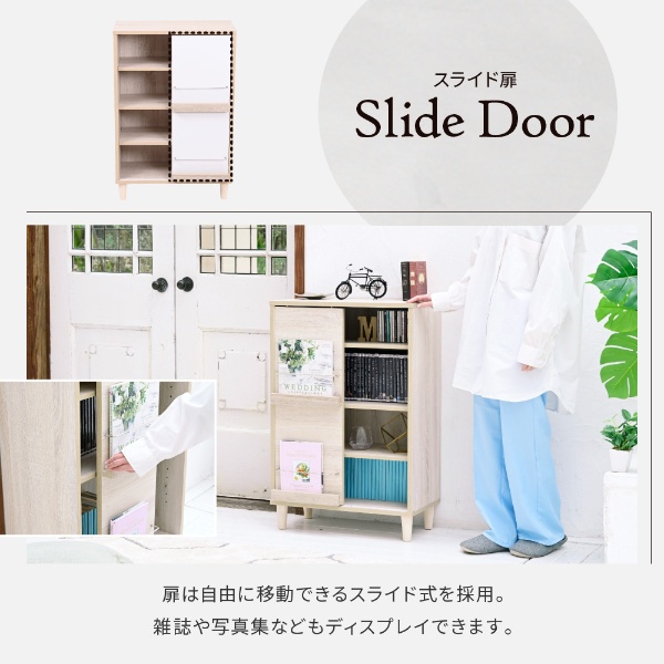 スライド扉&オープンキャビネット。6つのデザインと5つのカラーからお選びいただける6デザインキャビネット”Adatto”。引き違い扉にディスプレイ、扉の位置で見せる部分と見せない部分を使い分け。