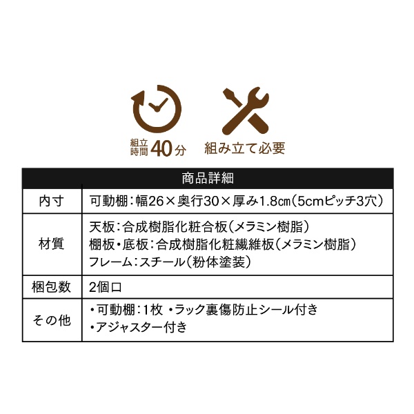 素材:[天板]合成樹脂化粧合板(メラミン樹脂) [棚板・底板]合成樹脂化粧繊維板(メラミン樹脂) [フレーム]スチール(粉体塗装)