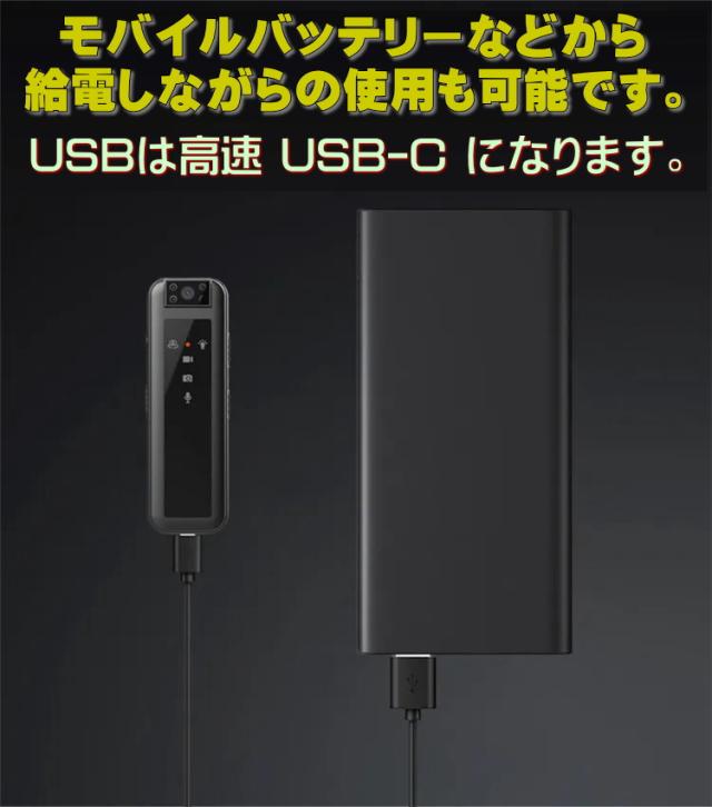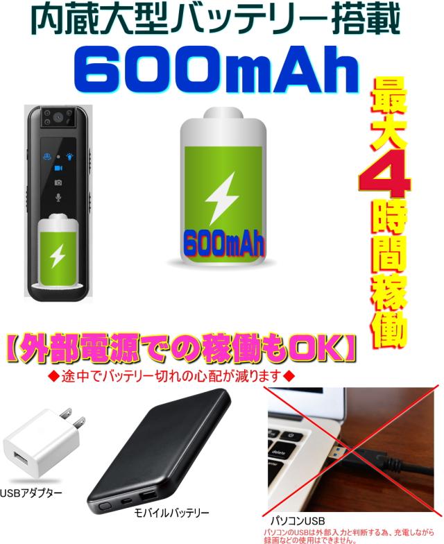 【充電録画】充電しながら録画も可能ですので電池切れの心配はいりません。その他、モバイルバッテリーからの給電もOK!(5V1A)