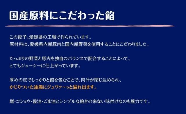 【原材料】野菜(キャベツ(国産)、たまねぎ(国産)、にら、にんにく、しょうが)、豚肉(国産)、豚脂、しょうゆ、食用ごま油、粒状大豆たん白、こしょう、食塩、皮(小麦粉、ラード、食塩)/加工でんぷん、調味料(アミノ酸等)、トレハロース、酸味料(一部に小麦・豚肉・ごま・大豆を含む)