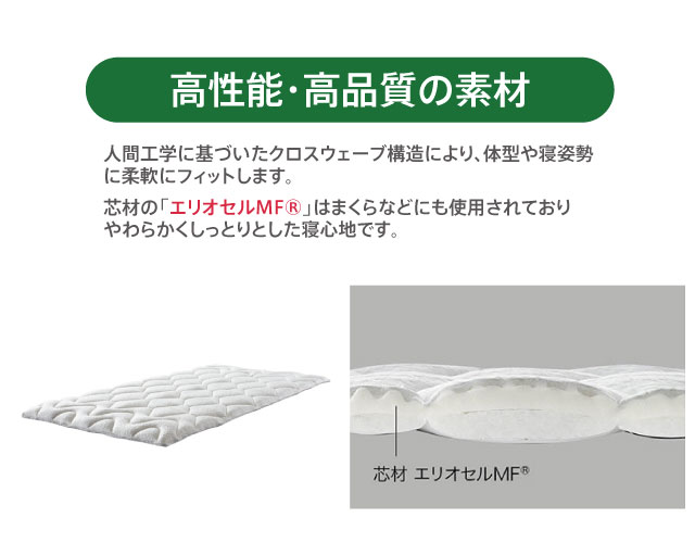 エリオセルMF・エリオセル・エリオファイバーの三層構造で贅沢な寝心地を実現致しました。通気性・体圧分散性に優れ、快適な寝心地と理想的な寝姿勢に導いてくれます。