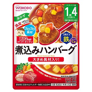 ハンバーグ(食肉(牛肉、鶏肉)、たまねぎ、つなぎ(パン粉(小麦を含む)、粉末状大豆たん白)、粒状大豆たん白、食塩)(国内製造)、ソース[野菜(にんじん、とうもろこし)、じゃがいも、しょうゆ、砂糖、オニオンソテー、ほうれんそうペースト、野菜ブイヨンペースト、チキンブイヨン、トマトペースト、バター/増粘剤(加工でん粉)、炭酸カルシウム、クエン酸、ピロリン酸鉄]