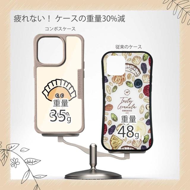 | 注意事項 | コンポスケースは、フレーム部分に「生分解性プラスチック」という環境に優しい素材を使用しております。そのため擦ったり、ぶつけたりする衝撃を与えると脆い部分もあります。耐衝撃ケースではないことをご了承ください。 Qi充電やMagSafe充電にも対応していますが、装着していない時に比べると充電速度は落ちます。 |