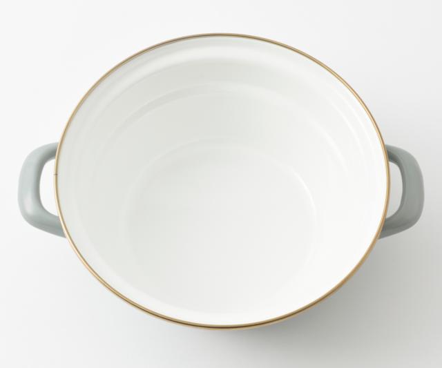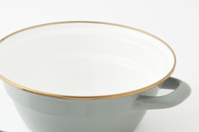ホーロー製品は手作業で釉薬(ゆうやく)をかけるため、縁や裏側に塗りムラが起こります。また、焼成の際に吊るして炉に入れるため、縁や取っ手の裏側に金具の跡が残る場合があります。