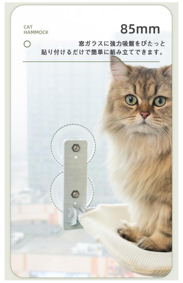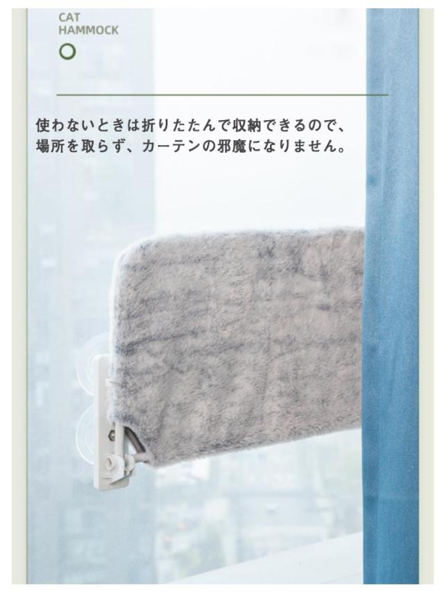 | 吸盤タイプ式猫窓用ハンモック、調節簡単でどこでも自由に設置可能です。 使わないときは折りたたんで収納できるので、場所を取らず、カーテンの邪魔になりません。 マット部分は外して水洗い可能なので、汚れたら,簡単に洗濯でき、いつでも清潔を保てる。 窓ガラスに強力吸盤をぴたっと貼り付けるだけで簡単に組み立てできます。 外出ができない猫ちゃんにも街の景色を眺める、暖かい日光に浴びてゆっくりくつろぎできます。 取り付け方: 棒を布カバーの穴に合わせて差し込みます。 ネジは図のように対応金具に通します。 ねじを締めます(左右に同じように操作します)。 穴に対合わせてナットをねじんで、吸盤を締めます。 吸盤とガラスの接触面を拭き取ります。 吸盤を強く押してハンモックを固定させます。 | |