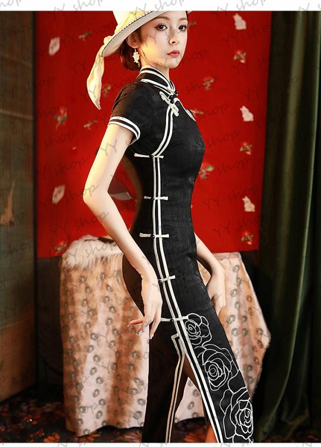 高品質 チャイナドレス パーティドレス ロングドレス チャイナ服 ワンピ スリット S~3XL 黒 白 宴会 二次会 発表会 撮影 イベント D081