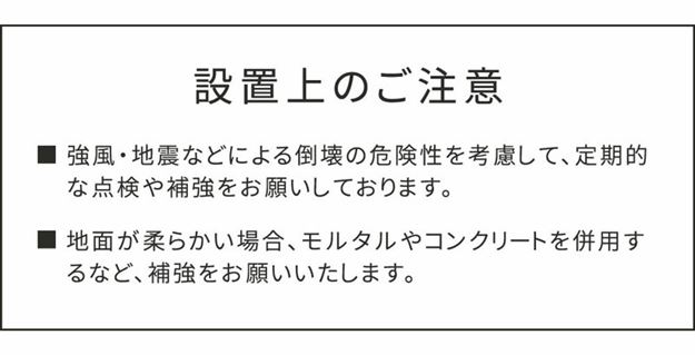●設置場所に合わせて、地面と金具をネジ又はアンカーボルト等で固定します。