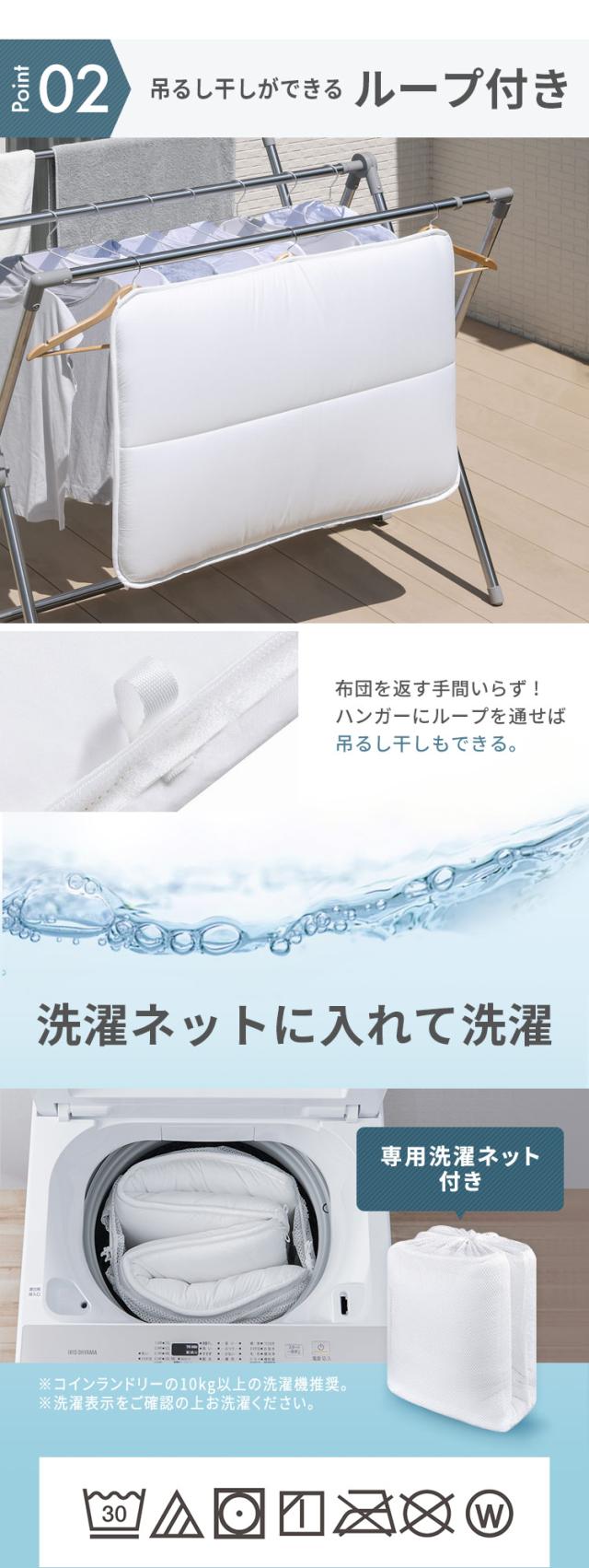 ・付属の専用洗濯ネットを使用し、説明書に記載の折畳み方で布団をネットに入れ、洗濯してください。