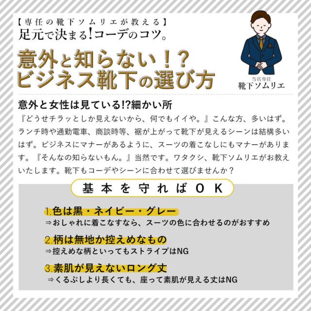 究極の素材と匠の技で作り上げました。 「究極のビジネスソックス」 海外産でお手ごろな価格のものが溢れる中、素材や品質がちょっぴり気になるトコロ。そんなあなたにこそぜひ試して頂きたい。 国内一の靴下生産の街、奈良県広陵町で生まれたビジネスソックスです。 オーガニックコットンを使用しているのでお子様やお肌の弱い方にも喜ばれています。 裏糸には消臭加工糸を使用することで気になる臭いを解消してくれます。蒸れやすい季節にも最適☆ つま先とかかとを補強することにより長くお使いいただけるようになりました。 細部にまでこだわりぬいた究極のビジネスソックスを是非お試しください。 |