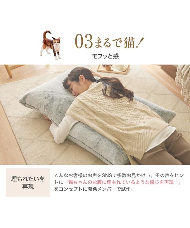 「猫Feelに埋もれたい」こんなお客様の声をヒントに、「猫ちゃんのお腹に埋もれているような感じを再現する」をコンセプトに開発した商品です!是非この商品で埋もれて下さい