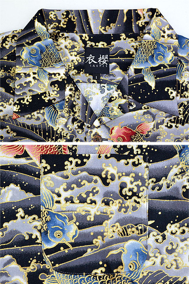 コットンアロハシャツ「金粉跳ね鯉」衣櫻 SA-1540 和柄 和風 日本製 国産 コイ オープンカラー