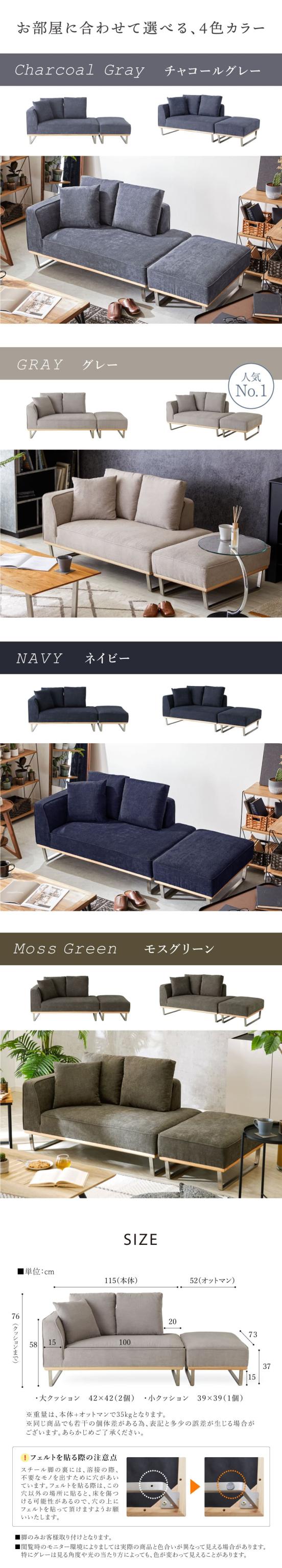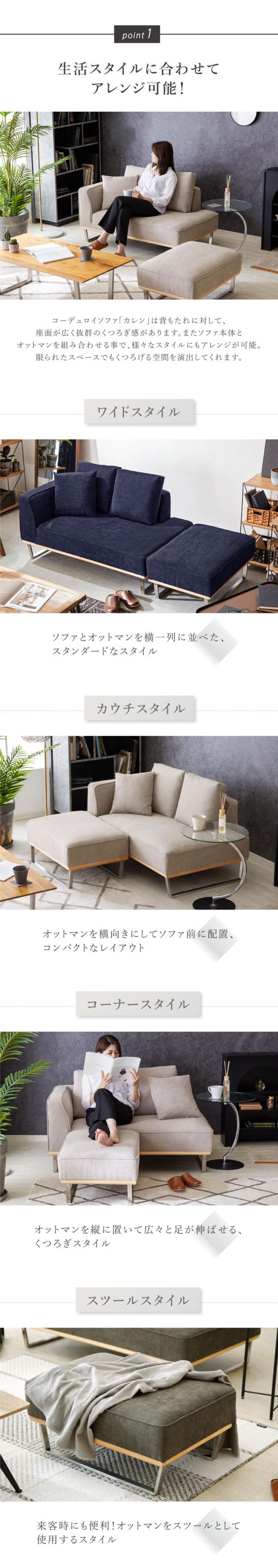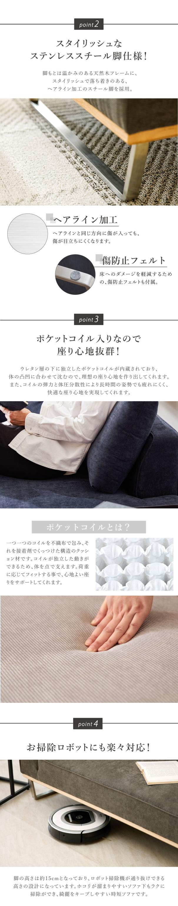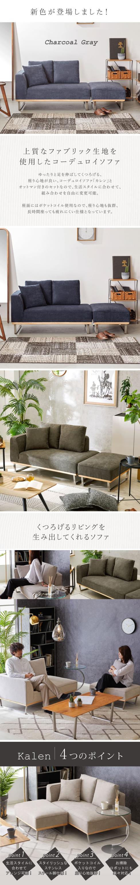 ■商品説明:座り心地抜群なポケットコイル構造のコーデュロイソファです。オットマンの配置を変えたり、使い方いろいろ!ステンレススチール脚でお掃除ロボットにも対応しました。
