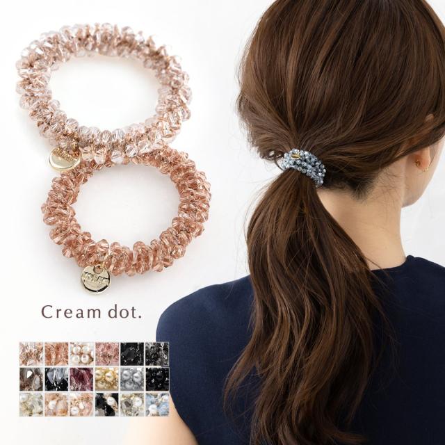 たっぷりのガラスビーズ/パールを編み上げたハンドメイドヘアゴム。動くたびに繊細な煌めきを放ち女性らしく爽やかな印象に。落ち着いたカラー展開で甘くなりすぎず、コーデに馴染みやすいデザイン◎